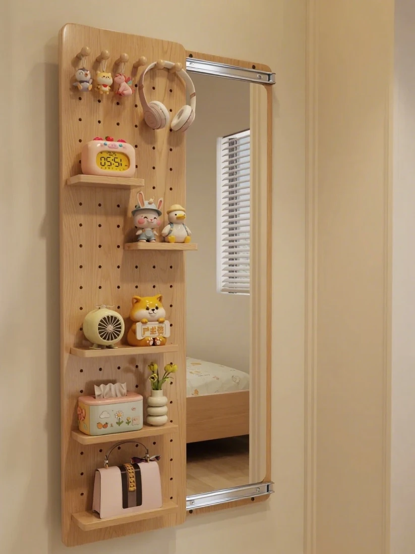 隠れた木製の穴あきボード、スライド式全身鏡 家庭用コートラック 壁掛け玄関試着鏡でスタイリッシュなコーディネートを実現!お部屋を広く見せる機能的なデザイン。
