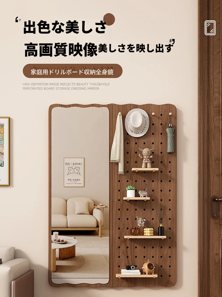 波浪デザインの穴あき全身鏡!便利な収納ラック付き、主寝室や玄関にぴったり。おしゃれで実用的な試着鏡として、毎日のコーディネートを楽しくサポートします!